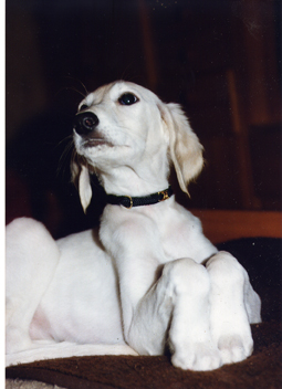 So trat 1991 mit "Begum King Salomon" der erste, eigene Saluki in unser aller Leben. Sie stieg aus dem Auto, jagte die Katzen brüllend auf den Baum, biß Chief herzhaft in die Rute und pinkelte dann erst einmal erschöpft von den bewältigten Aufgaben auf die Lehne meiner neuen Schlafcouch. Mahlzeit! Das fing ja prächtig an....