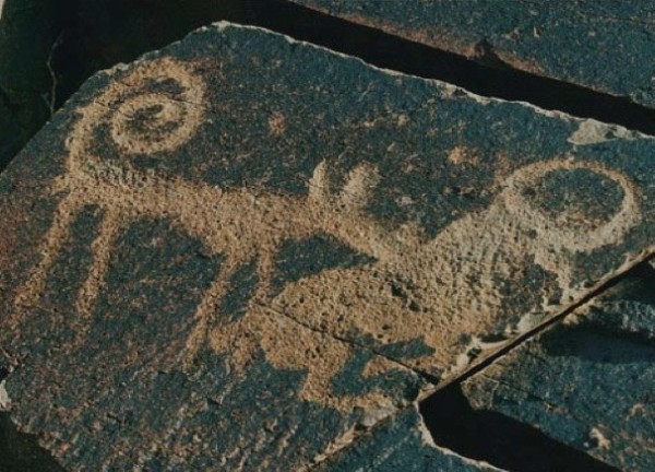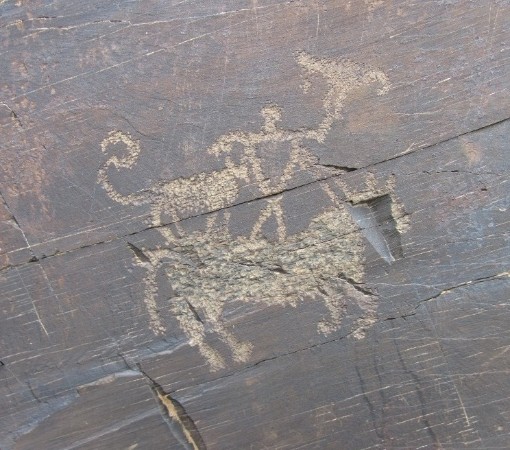 Ich gebe zu, daß mir der Vergleich mit einem Saluki etwas schwerfällt, möchte mich aber durchaus nicht mit garantiert kompetenteren Wissenschaftlern auseinandersetzen. Das einzige, was ich erkenne, ist ein stehohriger Hund mit marsipulami-ähnlicher Rute – und er ist definitiv kurzhaarig! Der offizielle Name dieses Petroglyphen auf Wikimedia ist: „Saluki-like hound horseback falconer“.