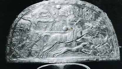 Ebenfalls im Tal der Könige fand sich folgendes Relief, das nahezu zeitgleich datiert wird und ebenfalls Tutenchamun zeigt, diesmal bei der Löwenjagd. Hier sieht man alle Typmerkmale des Salukis am deutlichsten.